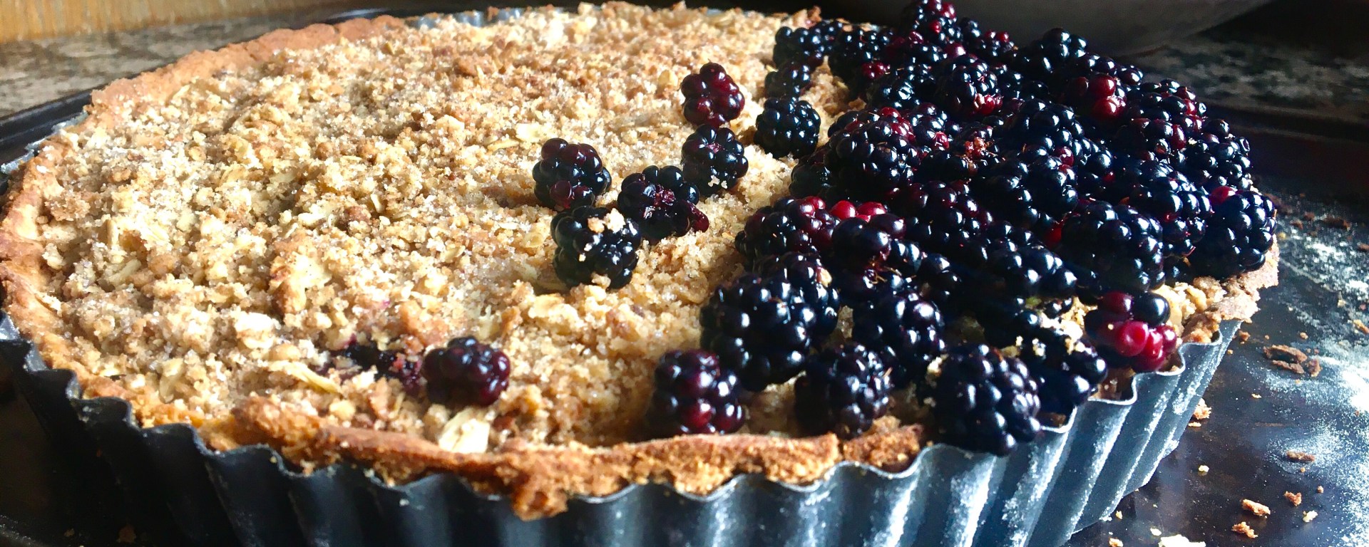 Fill the pastry case with the apples and blackberry and bake uncovered while making the topping.