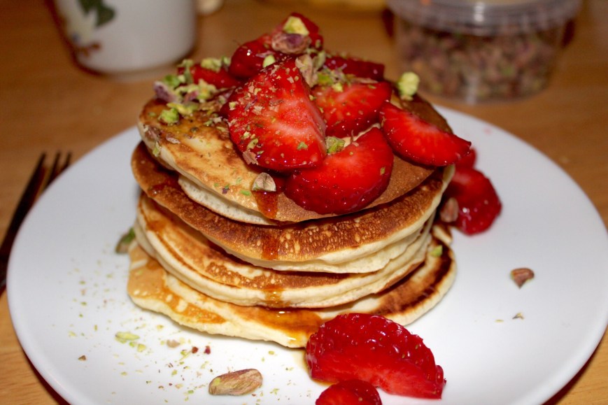 This recipe serves three or four people, depending on appetite and love of pancakes. Whether you choose to top with lemon and sugar or simply eat as they are, how you have your pancakes is totally individual and unique to you. The photo above was my Pancake Tuesday 2019 creation, topped with strawberries, pistachio nuts and a drizzle of maple syrup.