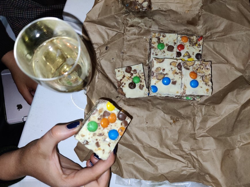Press firmly into the prepared cake tin and chill in the fridge for 15 mins before pouring over the white chocolate, melted. Sprinkle over any remaining chocolates and allow to set overnight before cutting into desired shape and size.