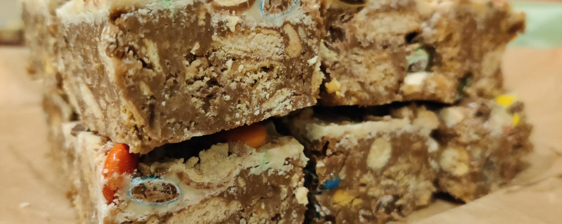 Press firmly into the prepared cake tin and chill in the fridge for 15 mins before pouring over the white chocolate, melted. Sprinkle over any remaining chocolates and allow to set overnight before cutting into desired shape and size.