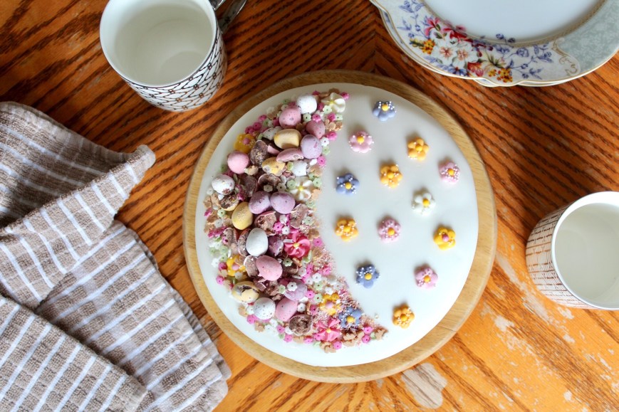 Contrary to tradition, I prefer to add a modern twist to my Easter cake. Last year, I kept it simple with a topping of mini eggs and sugar flowers. The previous year I went with mini Kinder eggs and Ferrero Rocher. And the year before that, I went for the gooey Creme Egg – I think doggo wanted a bite! To see how I decorated my 2020 Easter check out my Instagram highlight.