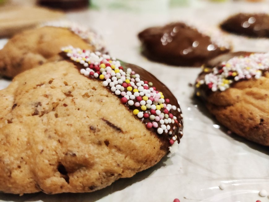 Bake for 15 mins before decorating with the remaining milk chocolate (melted) and sugar sprinkles.
