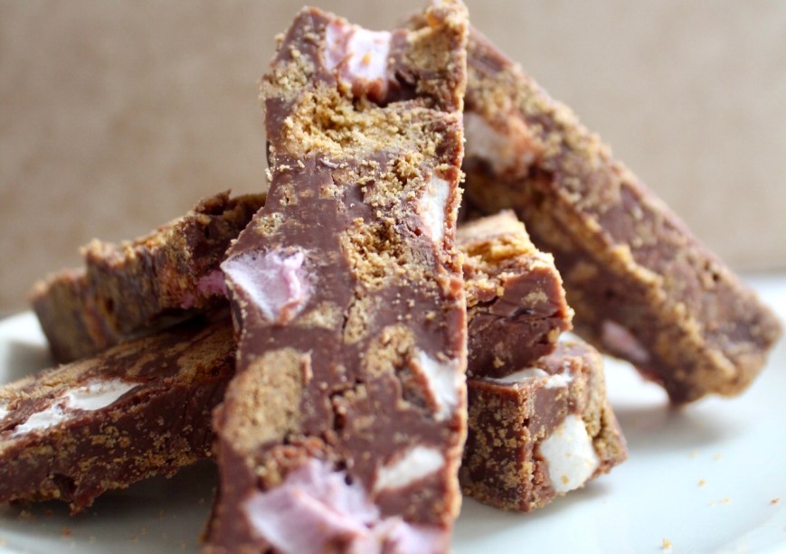 Remove the mixing bowl from the heat and stir in the biscuits, marshmallows and Mars bars.