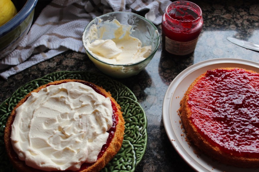 Allow to cool completely in the tins before removing and sandwiching together with raspberry jam and fresh cream.